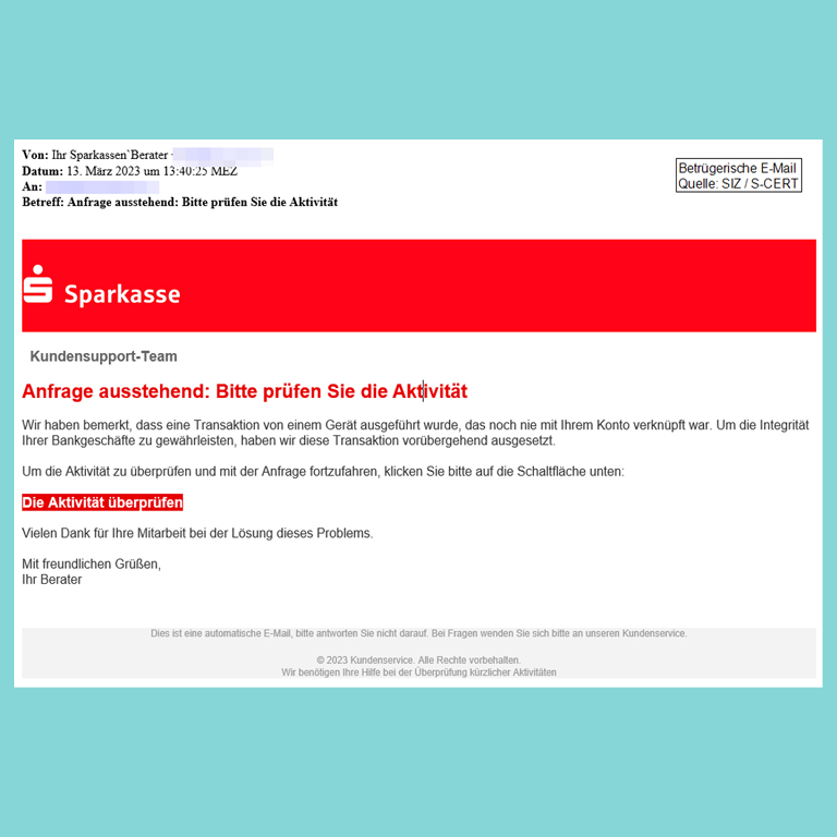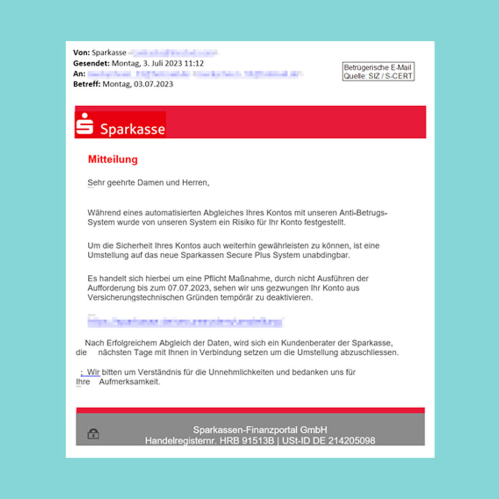 3. Betrug verhindern Früher gruben Bankräuber einen Tunnel unter die Bank, um in Tresore voller Geld einzudringen. Heute brechen sie ins Onlinebanking ein. Im dritten Kapitel des Fokusmoduls lernst du ihre Tricks kennen und erfährst, wie du dich schützen kannst. 1. Was wollen Betrüger? Für einen digitalen „Einbruch“ brauchen Betrüger zunächst deine Zugangsdaten, also deinen Benutzernamen und dein Passwort bzw. deine PIN. Von wem sie die bekommen? Von dir – wenn sie dich so austricksen, dass du sie ihnen verrätst. Dazu später mehr. Angenommen, Kriminelle haben sich Zugang zu deinem Online-Konto verschafft. Was können sie mit diesem Zugang anstellen? Finanzen ausspähen Sie können sich einen Überblick über deine Finanzen verschaffen und entscheiden, ob sich ein Betrug überhaupt lohnt. Falls es sich aktuell nicht lohnt, können sie es später immer noch versuchen. Informationen sammeln In der Regel sind im Onlinebanking die Kontaktdaten deiner Ansprechperson in der Bank hinterlegt. Das macht es den Kriminellen leichter, im Namen der Bank z. B. mit dir zu telefonieren und dein Vertrauen zu gewinnen. Sie fragen im Telefonat vielleicht auch dein Geburtsdatum oder deine Anschrift ab und sammeln auf diesem Weg weitere Informationen. Deine Kontakte ausnutzen Sie können sich als all jene Personen oder Unternehmen ausgeben, die sie in deiner Umsatzliste finden – zum Beispiel als Energieversorger, Internetanbieter oder Vermieterin. Gleichzeitig geraten Menschen aus deinem privaten oder beruflichen Umfeld nun selbst ins Visier der Kriminellen. Geld überweisen und Limits erhöhen Das Hauptziel aller Bankbetrüger ist es, Überweisungen von deinem Konto zu veranlassen. Damit mehr Geld zur Verfügung steht, können sie Lastschriften zurückgeben, Limits erhöhen und Kredite beantragen. Manchmal richten sie dafür auch Zwischenkonten ein oder kaufen Guthabenkarten, Kryptowährungen und Abos. Den Banking-Zugang vollständig übernehmen Dies ist einer der häufigsten Schadensfälle, der gleichzeitig das höchste finanzielle Schadenspotenzial hat: Mit deiner Hilfe können es Kriminelle schaffen, ein neues Gerät für die TAN-App zu registrieren. Auch können sie Giro-, Debit- oder Kreditkarten digitalisieren, sodass sie mit ihren eigenen Smartphones auf deine Kosten bezahlen können. Sie können außerdem neue Karten bestellen und deine Karten sperren. Kurz gesagt: Haben sich Kriminelle Zugang zum TAN-Verfahren verschafft, können sie in deinem Namen beliebige Finanzgeschäfte abwickeln. Außerdem können sie deine Zugangsdaten ändern und dich so aus dem Onlinebanking aussperren. Fünf Regeln für sicheres Onlinebanking Gib niemals Zugangsdaten zum Onlinebanking an Dritte heraus – keine PIN, keine TAN, kein Passwort. Gib nur Aufträge frei, die du selbst angelegt hast. Folge keiner Aufforderung von Dritten, irgendeinen Auftrag freizugeben. Reagiere nicht auf Nachrichten bezüglich Log-ins von Dritten in dein Onlinebanking. Leg sofort auf, wenn jemand am Telefon nach PIN oder TAN fragt, oder blockiere die Person im Messenger. Deine Bank wird dich nie nach Passwörtern fragen. Sobald du das Gefühl hast, dass etwas nicht stimmt: Wende dich an deine Bank. Als gelesen markieren 2. Was ist „Phishing“? Die Tricks, mit denen Kriminelle sich heute Zugang zu Girokonten verschaffen, werden unter dem Begriff Phishing zusammengefasst. Das englische Wort setzt sich zusammen aus „password“ (Passwort) und „fishing“ (Angeln). Phishing-Versuche ähneln sich oft im Ablauf. Die Kriminellen versuchen, dich mit fadenscheinigen Begründungen dazu zu drängen, auf einen Link in einer Mail zu klicken. Sie schaffen das, indem sie dir drohen, zum Beispiel mit einer Sperrung oder Kündigung. Oder sie erzeugen Zeitdruck durch etwas Positives, zum Beispiel ein vermeintliches Gewinnspiel, das bald abläuft. Dieses Vorgehen, dich gezielt unter Druck zu setzen, ist ein wesentlicher Teil des gesamten Betrugsprozesses. Wenn solche Methoden eingesetzt werden, spricht man auch von Social Engineering, also „sozialer Manipulation“. Klickst du auf einen Link in einer betrügerischen E-Mail, dann landest du auf einer gefälschten Webseite, die so aussieht, als wäre sie von deiner Bank. Gibst du dort deine Zugangsdaten oder persönliche Daten wie Telefonnummer oder Anschrift ein, landen sie sofort bei den Kriminellen. Achte deshalb immer auf die Adresszeile im Browser – oder klicke am besten gar nicht erst auf den Link. Phishing passiert nicht nur mit gefälschten Bank-Websites. Auch Versanddienstleister, Onlineshops und andere Anbieter müssen regelmäßig für Betrugsversuche herhalten. Deshalb solltest du für jeden Dienst, ob Onlinebanking oder nicht, ein eigenes Passwort bzw. eine eigene PIN verwenden. Mehr über Passwörter und Log-ins erfährst du im DiFü, auf DiFü-News und im DsiN-Ratgeber „Benutzerkonten sichern“. Als gelesen markieren 3. Schau hin! Dein Phishing-Training Wirf einen Blick auf die folgenden 12 E-Mails. Viele Adressen und Links sind absichtlich verpixelt, denn jede dieser Nachrichten ist eine echte Phishing-Mail. Das heißt auch: Sie enthält konkrete Anhaltspunkte für einen Betrugsversuch. Entdeckst du alle Hinweise? Diese plumpe Phishing-Mail ist schnell entlarvt: Die Absendeadresse gehört eindeutig nicht zu einer Bank. Auch die unpersönliche Ansprache und der Rechtschreibfehler passen ins Bild einer Fälschung. Auch diese Absendeadresse passt nicht zum Namen des Absenders. Neben der unpersönlichen Ansprache und der Drohung mit einer Kontosperrung gibt es ein viertes Indiz: Bei Kreditinstituten liegen „fehlende Angaben“ jedweder Art nicht im Zuständigkeitsbereich einer „Newsletter-Redaktion“. In dieser Nachricht wird der Empfänger oder die Empfängerin ebenfalls nicht persönlich angesprochen, sondern nur als „Sparkasse Kunde“ mit fehlendem Bindestrich. Als Absender fungiert sogar die „Spakasse“. Die Drohkulisse wurde hier gleich aufs gesamte Vertr