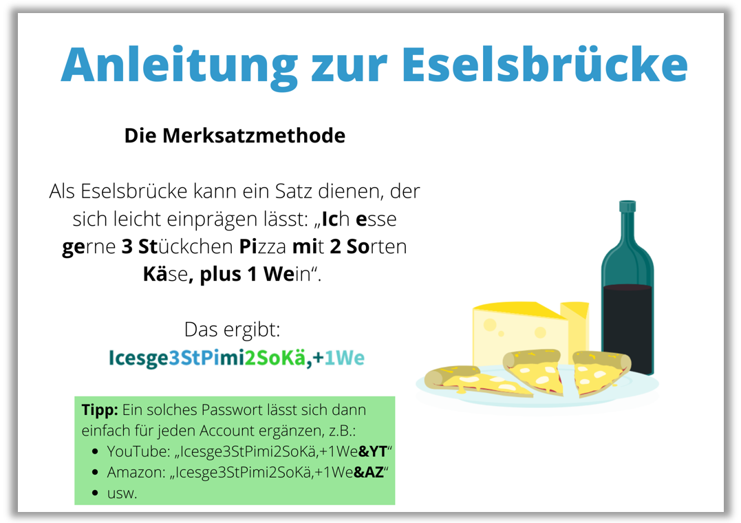 Wir alle können uns mithilfe von Gedankenstützen Dinge besser merken. Aus diesem Grund sind Eselsbrücken oder Merksätze bei der Wahl eines sicheren Passworts sehr nützlich – und weil sie etwas ganz Persönliches sind, kann sie kaum ein Algorithmus knacken. Ein Spruch, eine Zeile aus einem Lied oder einem Gedicht, eignen sich hervorragend als Basis für das Erstellen sicherer Passwörter.